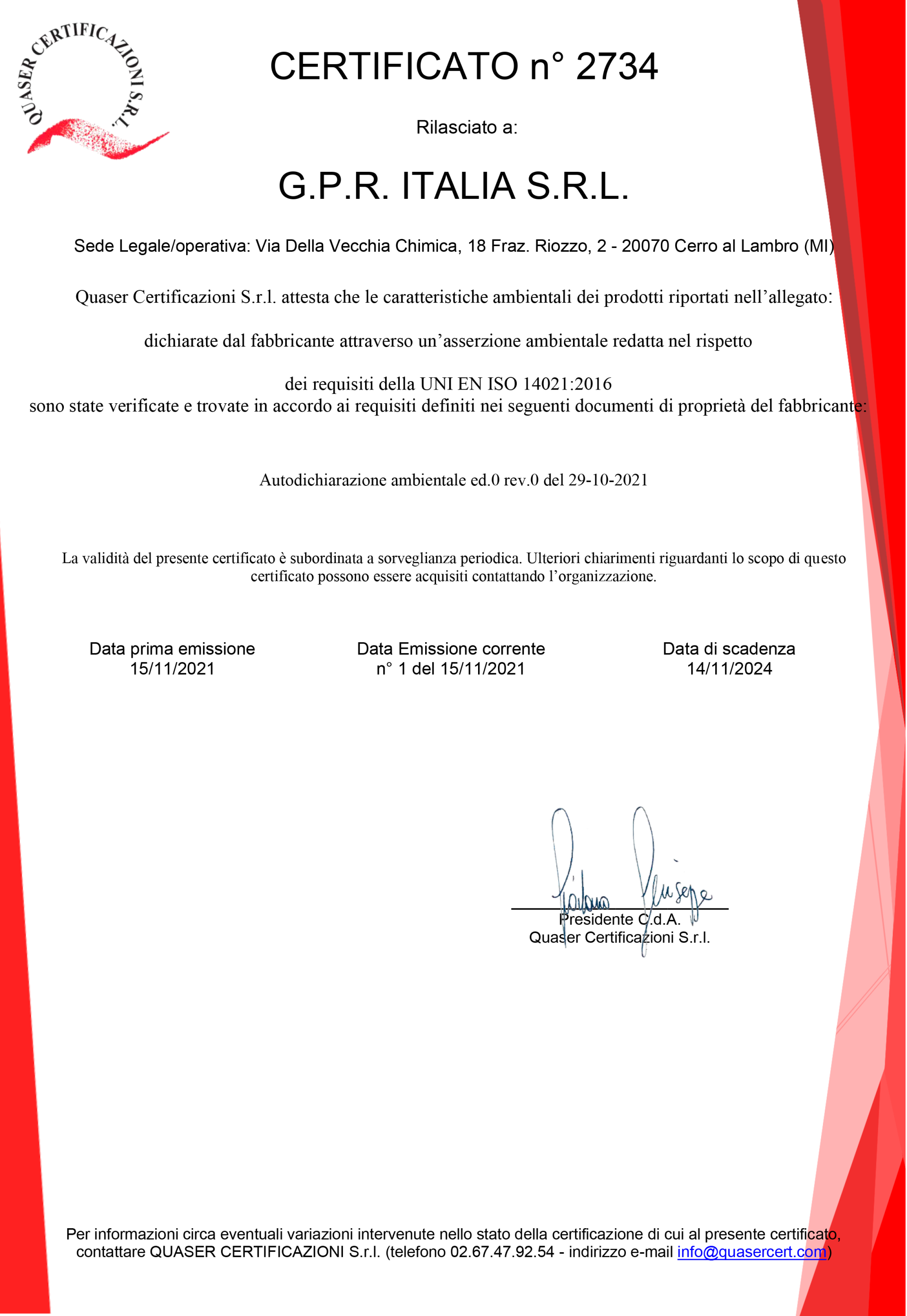 La direction reconnaît, comme un choix stratégique pour son activité commerciale, le développement d'un Système de Gestion de la Qualité certifié selon la norme ISO 9001:2015. Elle s’engage à mettre en œuvre cette décision en s’assurant et en vérifiant que la Politique est comprise, partagée, mise en œuvre et appliquée par tous les employés et collaborateurs de GPR ITALIA, ainsi que partagée avec toutes les parties prenantes.