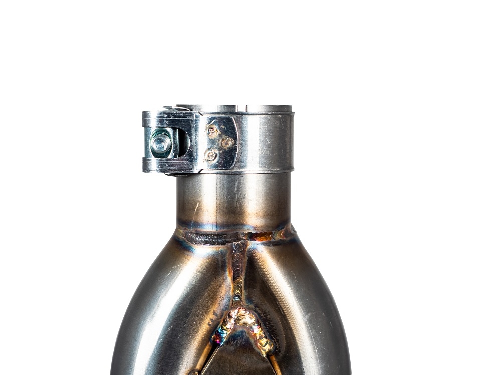 F205, échappement spécial avec double sortie de gaz "corne", en acier inoxydable 304 avec soudure TIG visible.